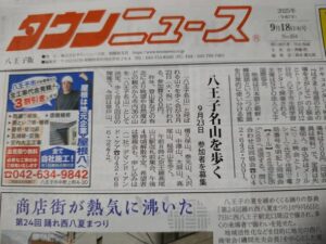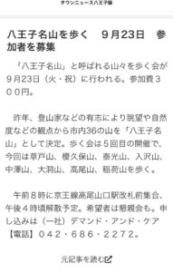 【ご案内】第7回TOKYO八王子八十八名山を歩こう!(9/23) 八王子タウンニュース(9/18号)に掲載していただきました。 9月23日(火・祝) 8時00分 京王線高尾山口駅改札前 集合・出発 16時00分 解散予定 持ち物:弁当、飲み物、ほか 参加費:300円(保険代ほか) コース: 草戸山〜榎窪山〜泰光寺山〜入沢山〜中澤山〜大洞山〜高尾山〜稲荷山 懇親会(有志):高尾山温泉 詳細はタウンニュースをご覧ください。 【YouTube】FMたちかわに出演しました(8/24・日) 前の記事 【ご案内】第8回TOKYO八王子名山を歩こう!(10月) 次の記事